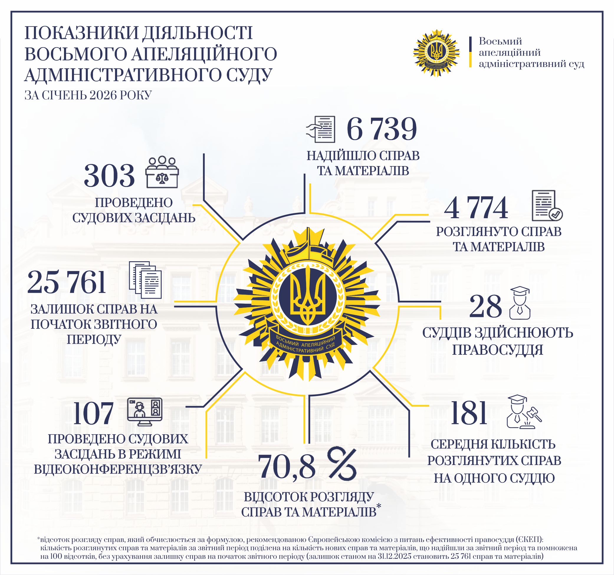 Діяльність Восьмого апеляційного адміністративного суду у січні 2026 року характеризується такими основними кількісними показниками: